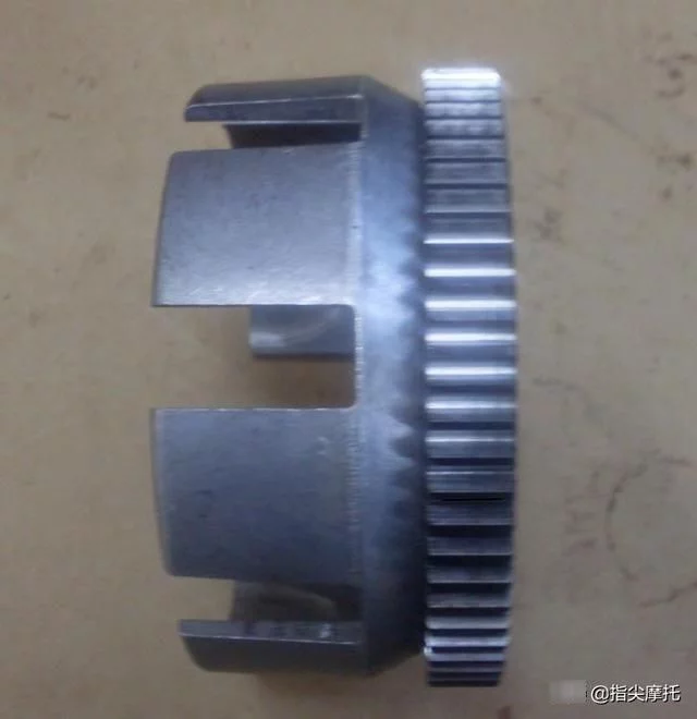 CL125-3春兰虎摩托车是仿制本田CB125T的产品,该曲轴结构中,如上面两图,曲轴右端面装有高速齿轮,它与变速器连接的零件为装在主轴右端面上的离合器主动毂大齿轮,如下图,其连接方式为内孔花键连接。